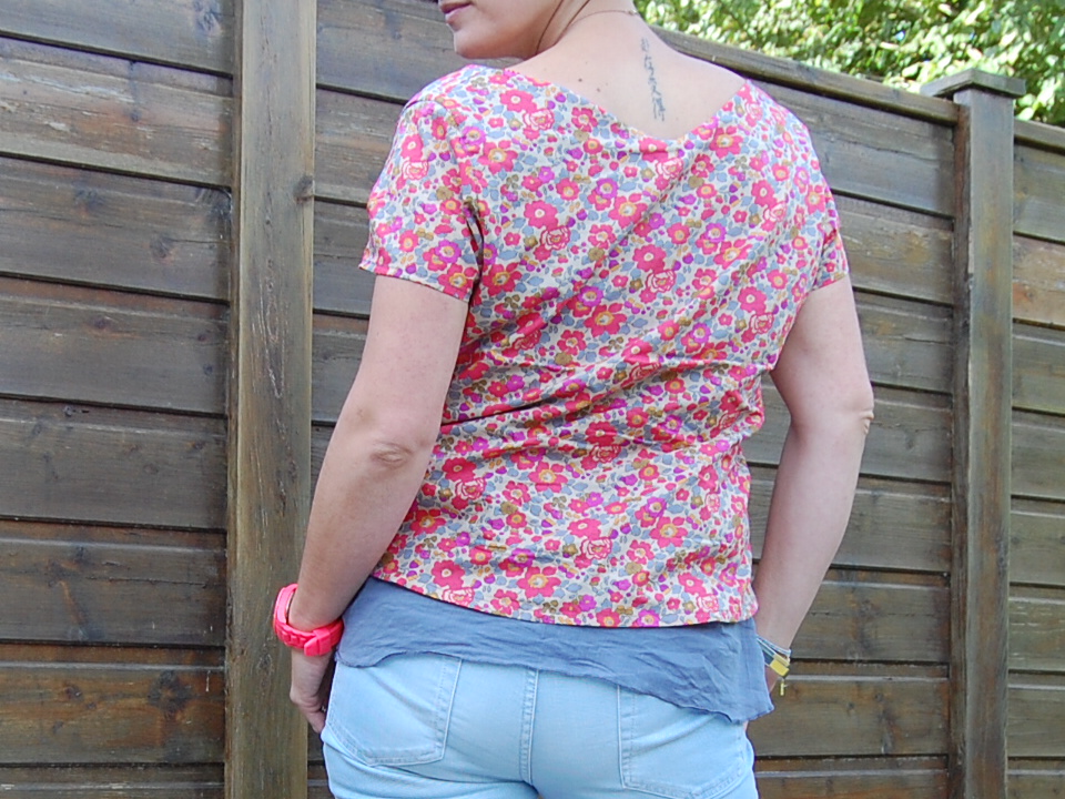 Le dernier né de la collection n'a rien de classique! Une encolure en V devant et derrière, une doublure qui dépasse, des petites manches pour les premiers jours un peu frais (dis-je au moment ou l'été est revenu).... Bref ce petit haut a tout pour plaire: rapide à coudre, facile, peu gourmand en tissu, bien taillé.... agréable à porter et beau!