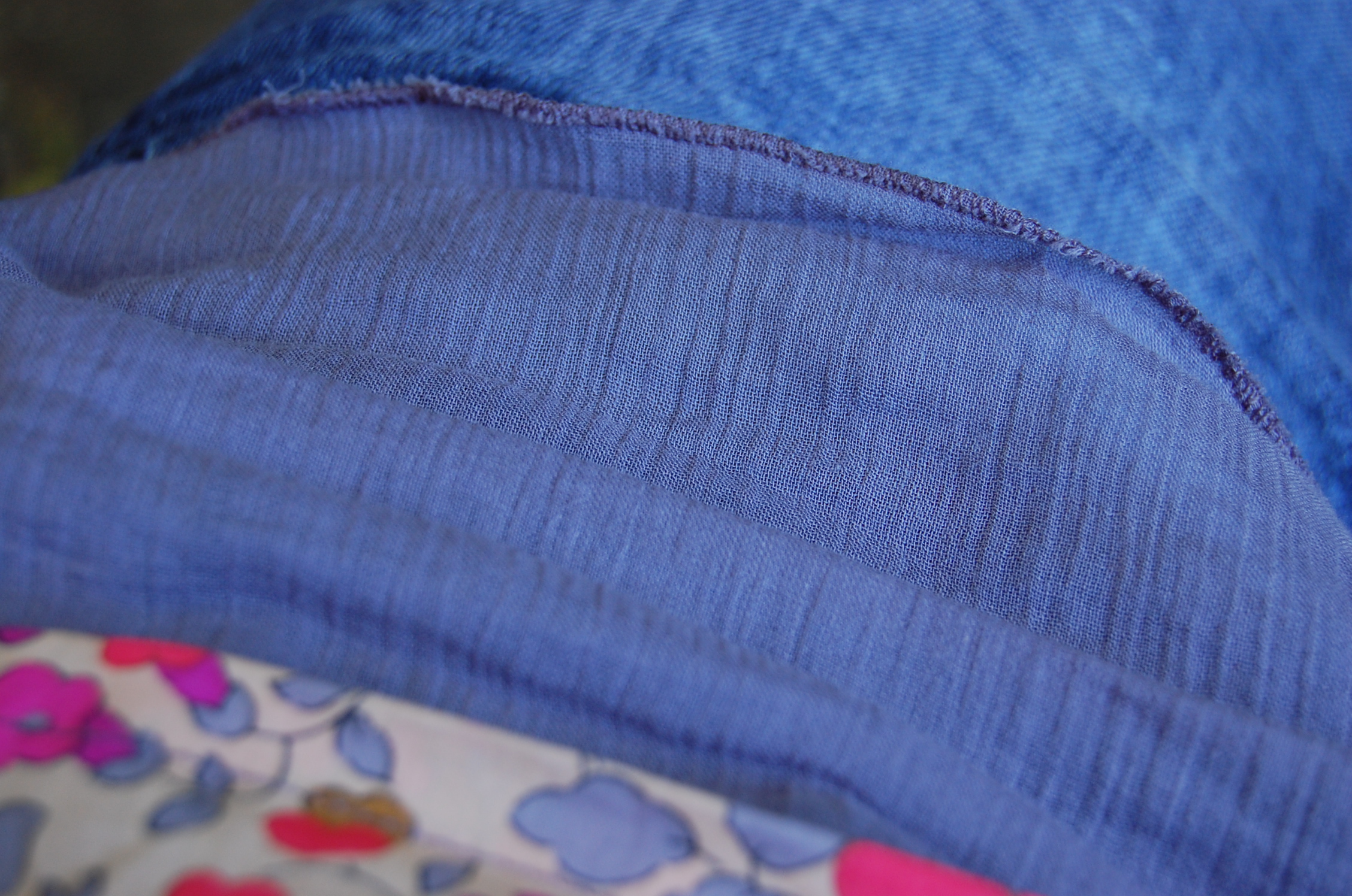 Je n'ai pas fait d'ourlet sur la doublure, juste un espèce d'ourlet roulotté avec un point de surjet très serré.... J'ai bien essayé de démarrer un ourlet classique... avant de comprendre que je n'y arriverais jamais sans tout faire gondoler et étirer mon tissu du double de sa largeur! Je cousais du crêpon pour la première fois, je m'en tire pas trop mal, j'ai eu peur pour l'encolure, mais l'ourlet c'était au dessus de mes forces!