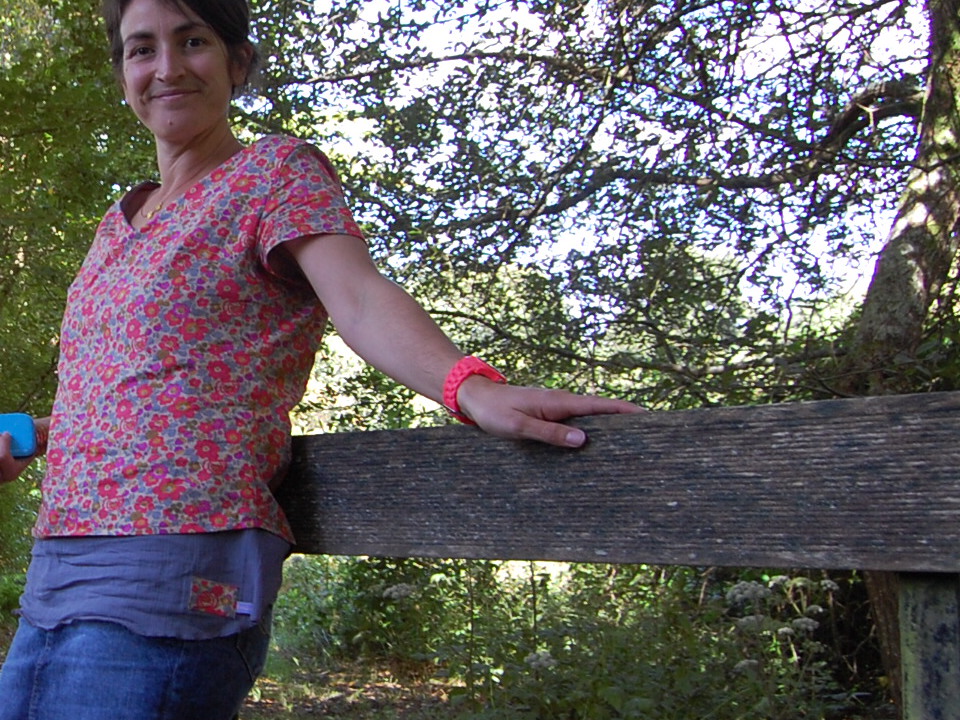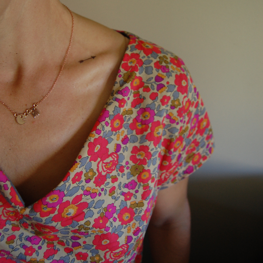 J'ai choisi pour cette première joueuse, un de mes liberty chouchou que je gardais précieusement, attendant LE projet idéal.... comme d'habitude, plusieurs projets lui ont été attribué sans jamais osé être coupé... Et finalement, il est parfait pour cette blouse, associé au crêpon orageux de France Duval Stalla.