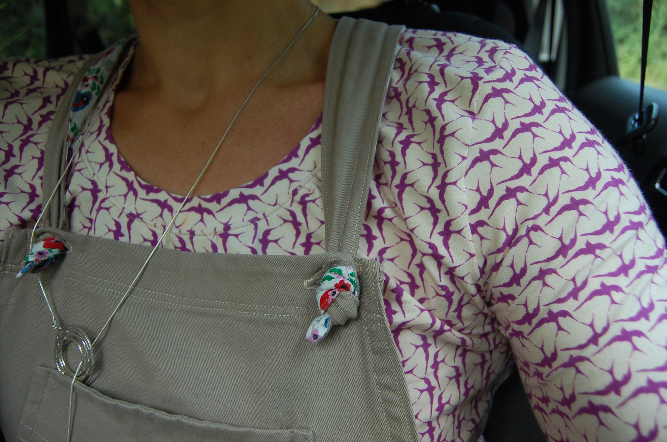 N'ayant pas de boucles de salopettes, j'ai fait des boutonnières sur le haut et je fais des noeuds sur les bretelles, je trouve ça rigolo...